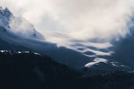 Cloudy moody sunset in snow mountains above Garibaldi Lake on Panorama Ridge