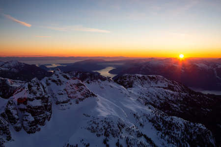 Aerial view of Canadian Mountain Landscape during a vibrant sunset. Taken near Squamish, North of Vancouver, British Columbia, Canada.