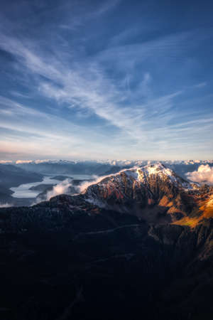 Aerial view from Airplane of the Iconic Mountain, Lions Peak. Colorful Sunset Sky Art Render. Howe Sound, North of Vancouver, British Columbia, Canada.