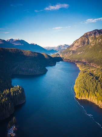 Aerial view of Lake surrounded by Trees and Mountains near Vancouver, British Columbia, Canada