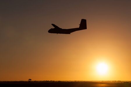 Silhouette of the Airplane over Beautiful Orange Sky. Sunset Background. Travel and Vacation Concept.