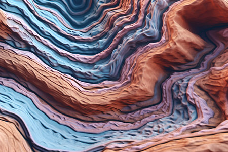 This abstract image showcases a stunning composition of vibrant earthy tones and intricate textures, resembling layered natural formations in a colorful landscape.