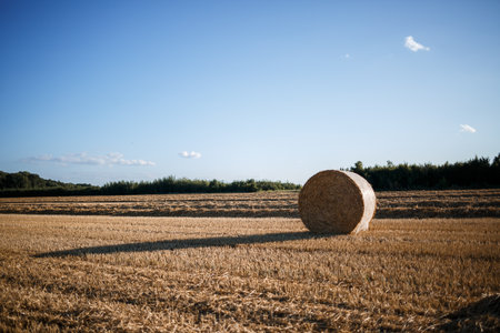 a harvested wheat field with straw stacks under a blue sky in summer