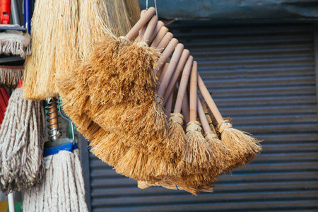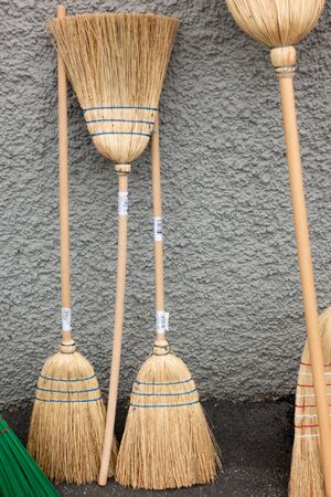 Broom at the market, close-up photo with shallow depth of field.