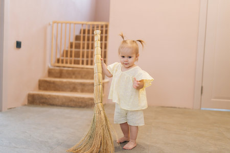 Portrait of barefoot toddler girl cleaning kitchen floor, gripping broom handle while assisting with housework in contemporary home setting, developing early sense of responsibility.
