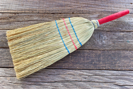 broom on wooden background. Spring cleaning concept.