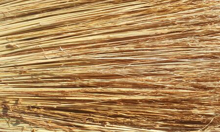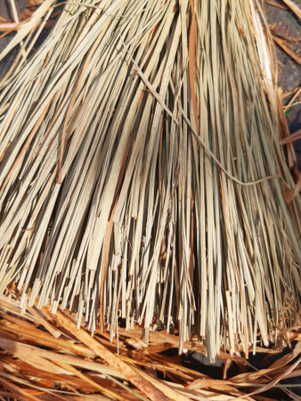 Coconut leaf broom texture. Detail of a heather broom for street cleaning. Dry straw texture. Raffia background. Cleaning tools.