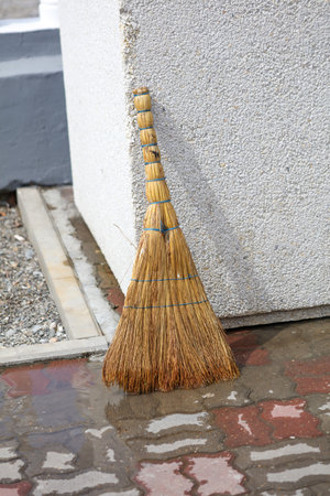 Broom on the threshold of a country house. Broom near the entrance to a house in the countryside