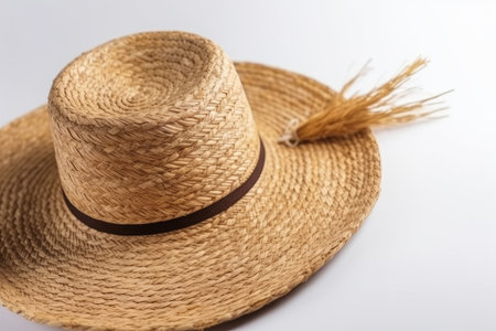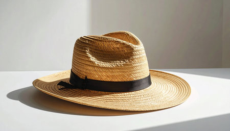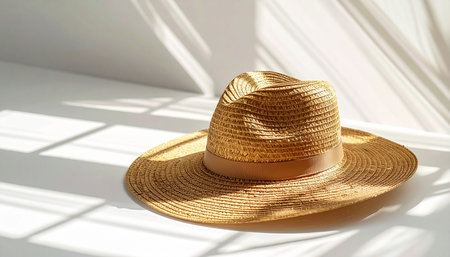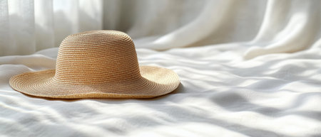 A beautiful straw hat lies gracefully on a white surface, casting soft shadows. This image captures the essence of summer fashion and leisurely days outdoors.