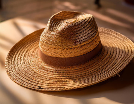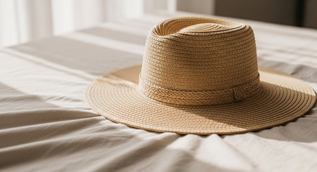 Casual showing straw fedora hat resting on a textured fabric surface with sunlight keywords: hat, straw,...