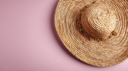 A straw hat is arranged in the bottom left corner of a smooth pastel background, leaving space in the center for added touches or text.