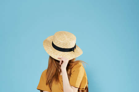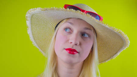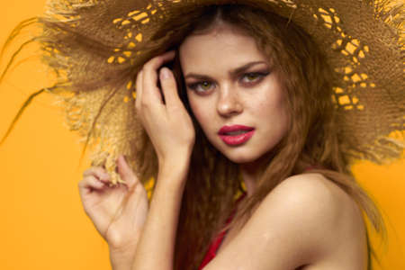 Woman in straw hat bright makeup summer lifestyle fun yellow background