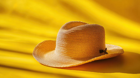This image features a stylish straw hat set against a bright yellow background, showcasing summer vibes and perfect for outdoor fashion. Ideal for seasonal themes.