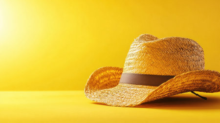 A classic straw hat sits elegantly against a vibrant yellow background, capturing the essence of summer and outdoor adventures with style and charm.