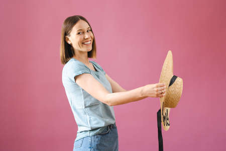 Portrait of joyful young woman in casual wearing straw hat on pink background. Cheerful young woman smiling during summer vacation.