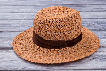 Hat on the table. Straw lady's hat with a black ribbon. Concept of rest and vacation. Table in a park cafe. Sunny hot weather.