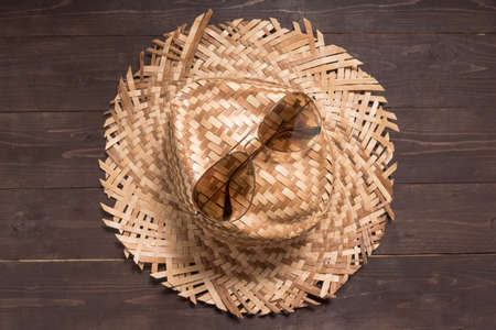 White straw hat on a dark wooden background, with a pair of blue shaded sunglasses