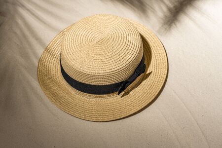 Summer straw hat on sand through the branches of palm and shadow palm tree. Travel, holiday, summertime concept. Top view.