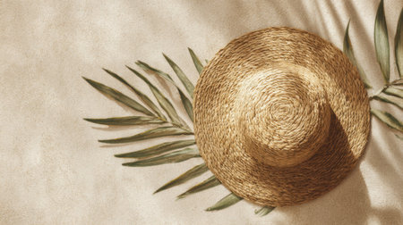A beautiful straw hat is placed on soft palm leaves evoking a relaxing tropical vibe.