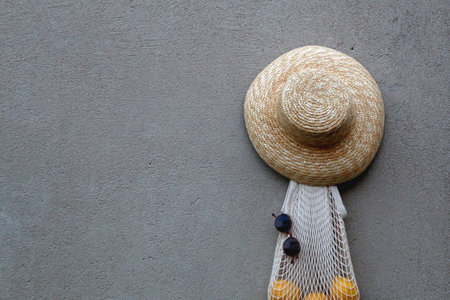 Reusable mesh bag filled with lemons, round sunglasses and straw hat, hanging on the concrete wall.