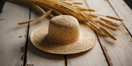 AI Generated. Straw Hat and Wheat on Rustic Wood Background