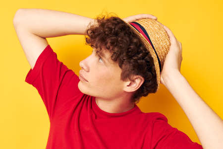 guy with red curly hair casual wear hat posing yellow background unaltered