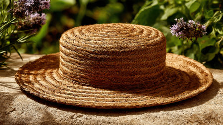 A wide-brimmed straw hat rests on a textured surface, illuminated by natural sunlight.