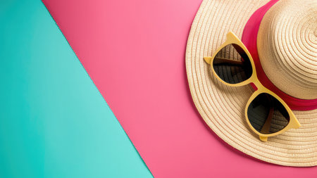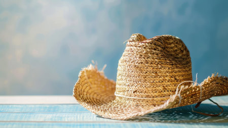 A beautiful straw hat rests on a bright turquoise background, capturing the essence of summer fun and outdoor adventures. Perfect accessory for sunny days.
