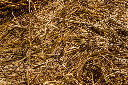 Close-up of yellow straw. Dry grass on an agricultural farm. Hay for feeding cattle. Photo in sunny autumn weather.