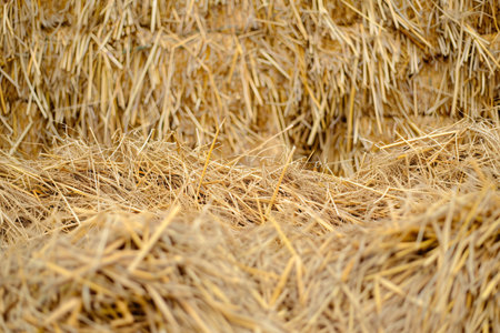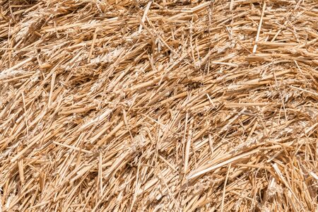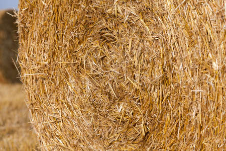 photographed close-up background stack of straw after the harvest of cereal crops