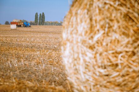 Hay bail harvesting in wonderful autumn farmers field landscape with hay stacks after cropping and golden ripening wheat field