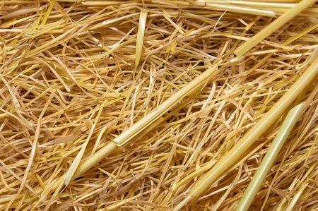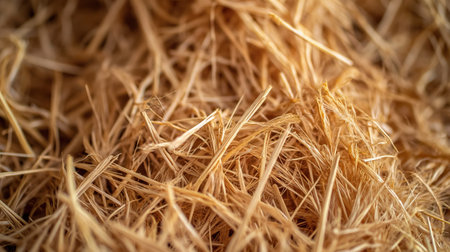 A detailed macro shot of dry, golden straw, with each strand crisply focused, highlighting the natural texture and patterns of the farm staple.