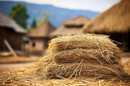 A traditional village haystack with focused foreground and space for text
