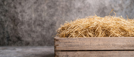 Pile of golden straw in a wooden crate