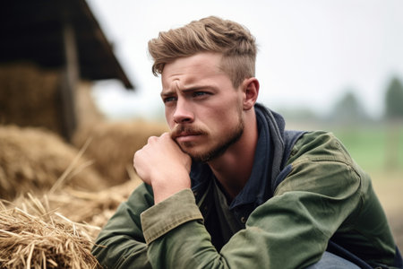 shot of a young man looking bored while working on a farm, created with generative ai
