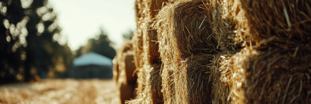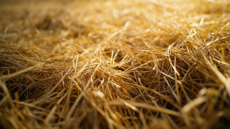 A close-up texture of tightly packed hay bale strands, highlighting the golden hues and rough textures of the straw.