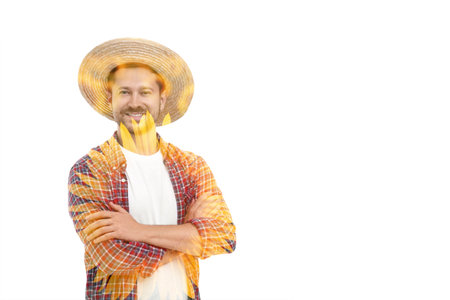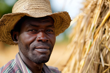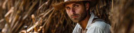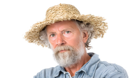Portrait photograph of male farmer looking at the camera. Wearing farmers clothing and a straw hat.
