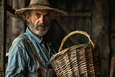 Elderly farmer in a straw hat poses with a handmade basket in a rustic barn setting