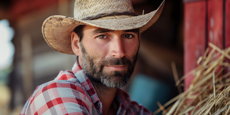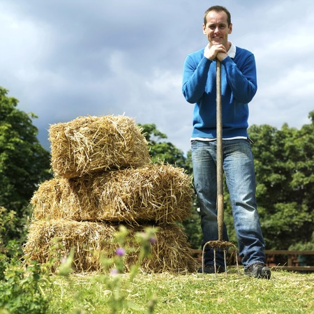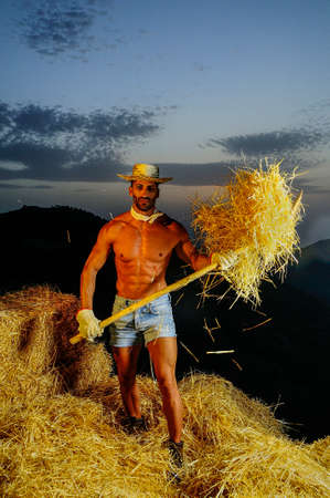 Handsome mature white male with a very contented, confident air about him sitting on stacks of fresh baled hay.