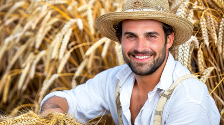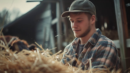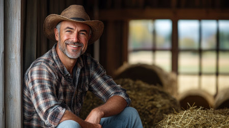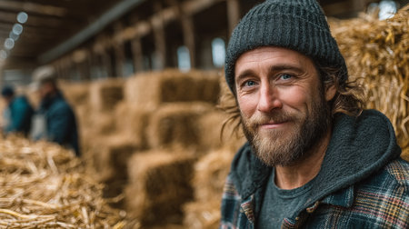 Young farmer smiling warmly in a barn filled with hay, showcasing agricultural lifestyle