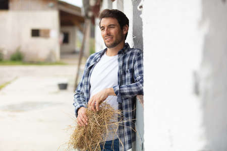 Man farmer standing with hay in his hands inside farm storage area