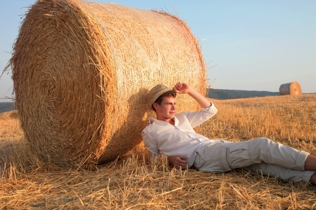 happy guy near a haystack on a ranch field. Happy man on nature background