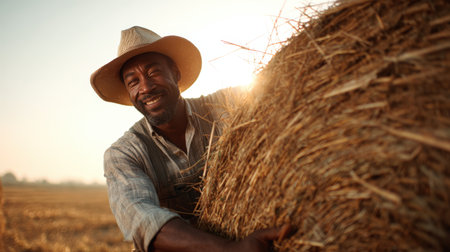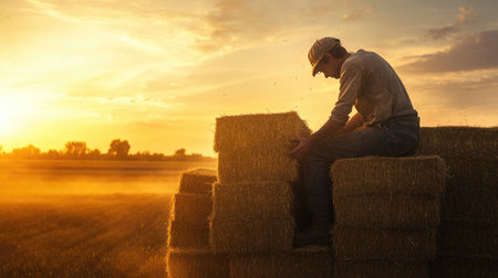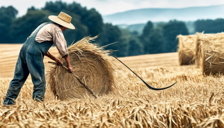A farmer in a straw hat manually baling hay with a pitchfork and large hay bales scattered across a vast wheat field, showcasing rural agricultural practices.. AI Generation