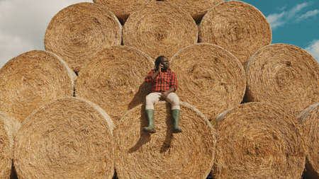 Farmer with straw bales in the field. Agriculture concept.