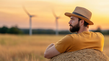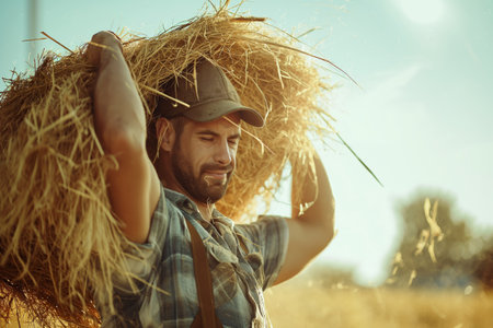 man with hay in field photo available to download, in the style of glowing lights
