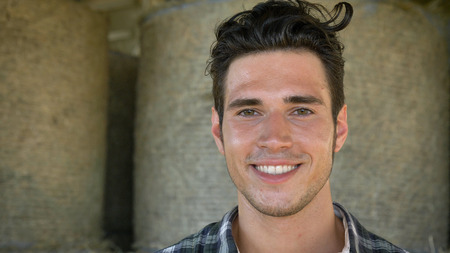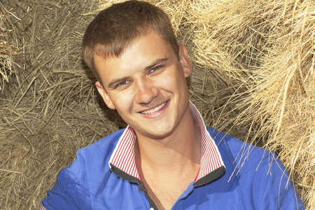 Portrait of a handsome young farmer (student) sitting on haystack, beautiful smile, in shirt, happy smiling.