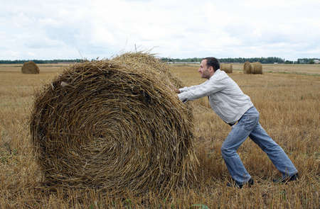 The man rolls a straw bale across the field