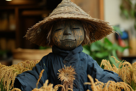 A wooden scarecrow with a straw hat stands among golden rice plants in a traditional farming setting during harvest season