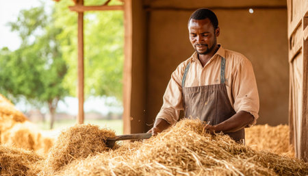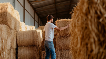 Man arranging straw bales in a barn during a sunny afternoon in rural countryside