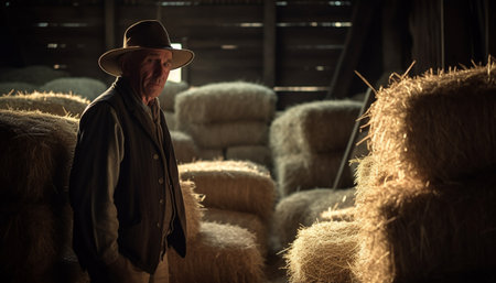 an old man in a hat standing in front of hay, in the style of flickering light